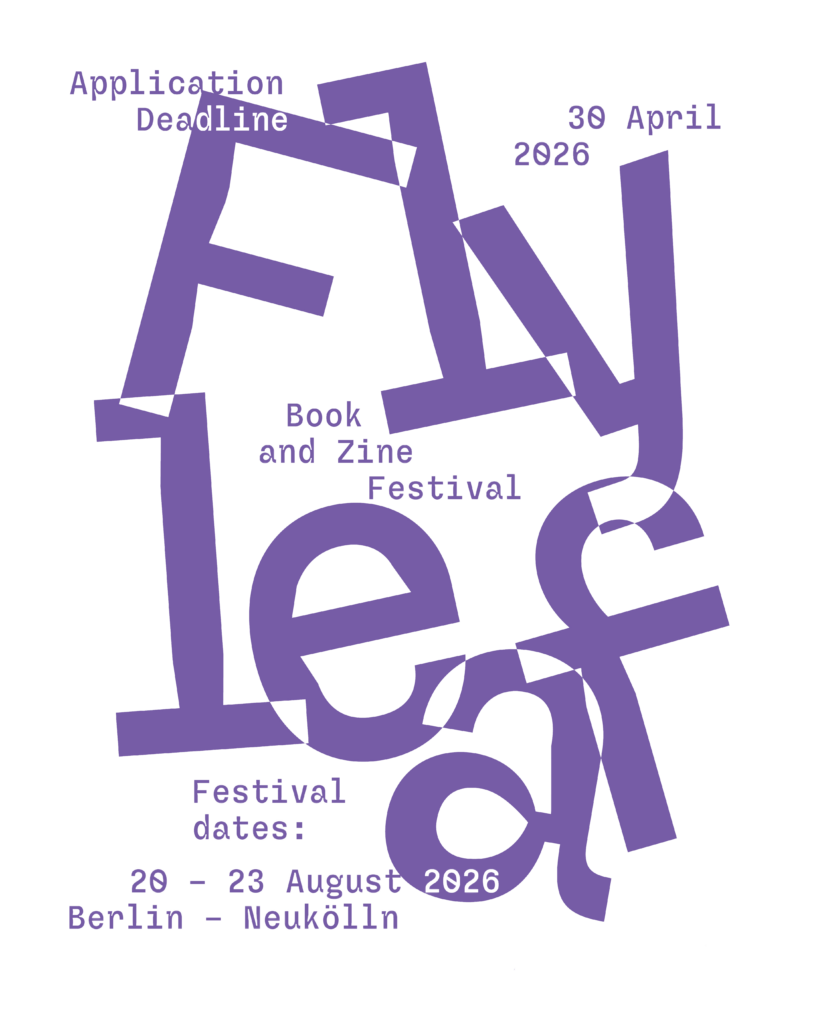 FLYLEAF is all about connecting, and sharing knowledge between publishers, artists, authors and readers, zine enthusiasts, and book lovers. A total of 90 international small press publishers, book and zine artists will participate in this year’s edition of the festival, which also includes a rich program of workshops, walks, round table discussions, readings, performances, and fire side chats. It is hosted by three independent spaces in Berlin-Neukölln, which are within walking distance and, due to their limited size, conducive to dialogue: Apartment, Falschrum, and WIRWIR. We welcome you to a weekend of inspiring discoveries and analogue creativity, a celebration of printed, folded, stapled, and sewn-bound civic magic!
